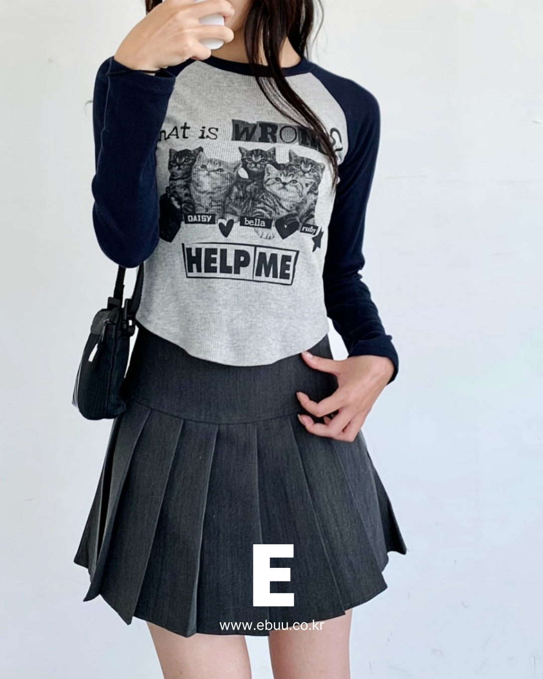 [키치무드/캣츠] 고양이 나그랑 배색 크롭 긴팔 티셔츠 - 4color