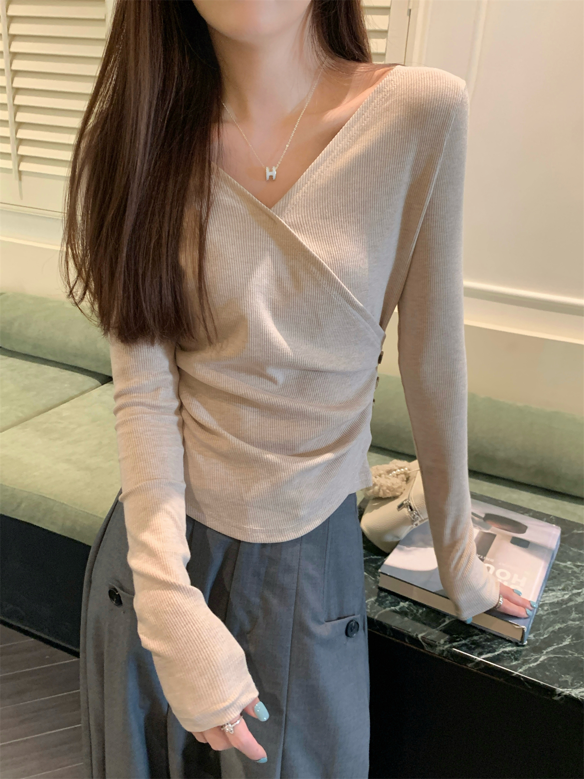 (동영상)크로스 브이넥 사이드 버튼 셔링 풀오버 긴팔 니트 티셔츠 OT327699