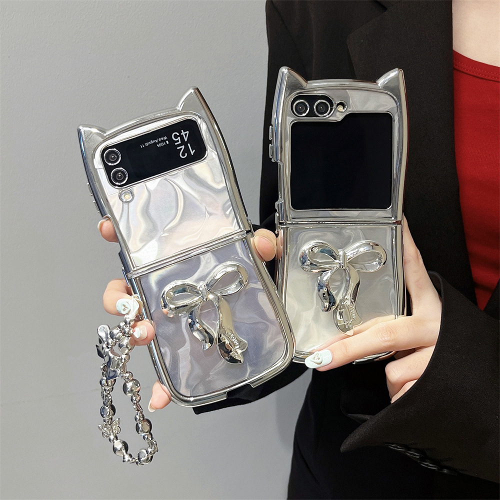 갤럭시 Z플립 6 5 4 3 ZFLIP 지플립 고양이귀 비즈 스트랩 실버 리본 장식 핸드폰 케이스 AZF2727
