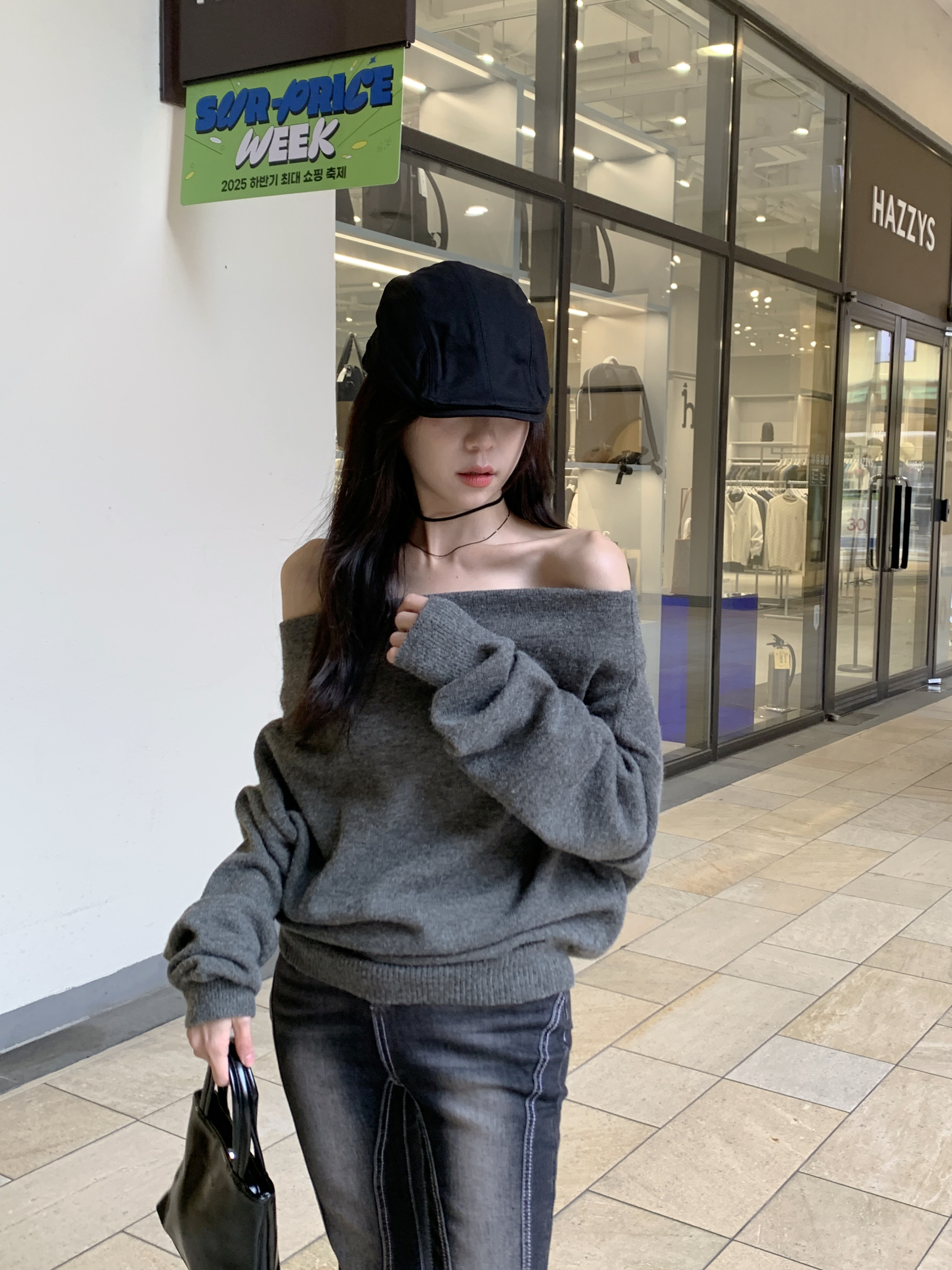 [하객룩🖤/오프숄더/도톰] 루즈핏 롱슬리브 니트 아피 2color/원숄더,보트넥,드레이프,가을,겨울,데일리룩,데이트룩,연말룩,일본여행룩