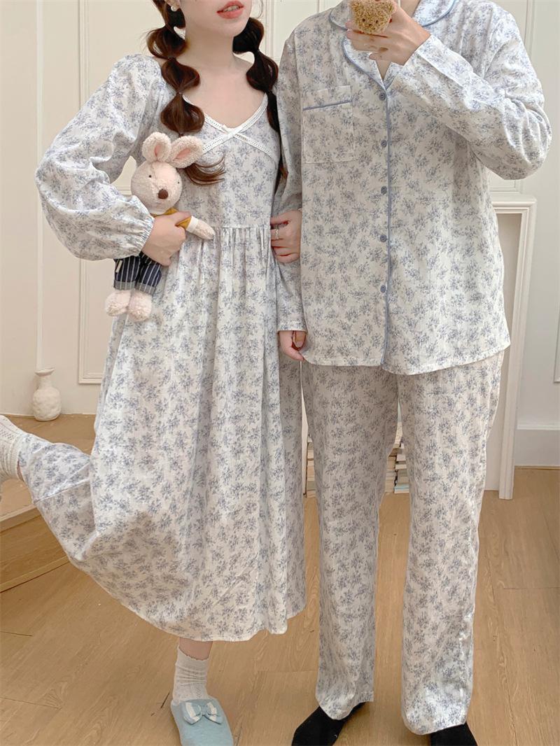 (커플잠옷) (리크원피스잠옷) 임산부잠옷 빅사이즈파자마 트임 꽃무늬 플라워 신혼 연인