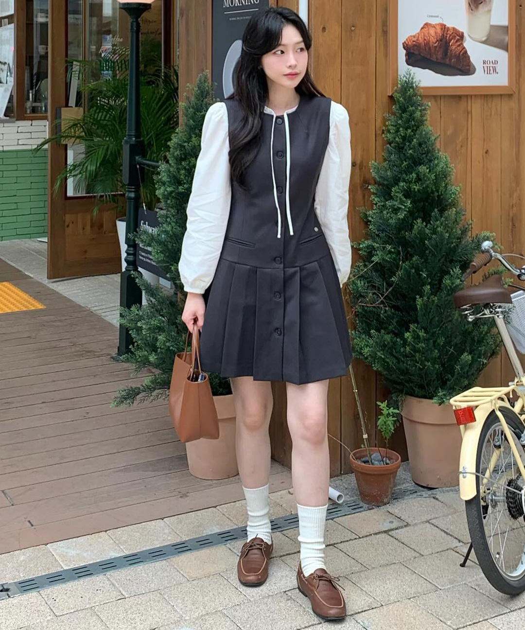 Classic lip pocket pleats mini dress - deep charcoal
