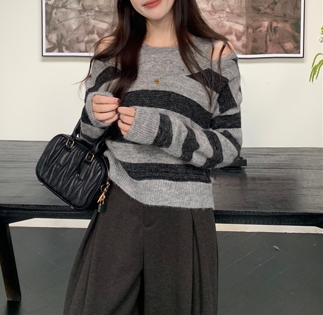 [오픈숄더/스트라이프💙]어깨트임 크롭 루즈핏 단가라 레이어드 니트 탑 181