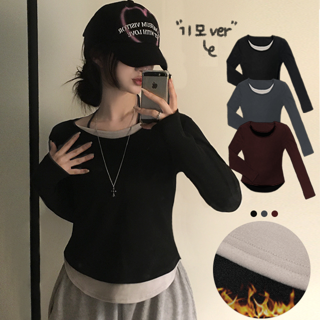[당일출고/기모이너필수템/자체제작]일체형레이어드 밑단굴림 긴팔티셔츠(롱슬리브 스퀘어 라운드u유넥 세미크롭 기본무지 y2k상의 가을겨울옷 오버루즈핏 히트텍 트레이닝복 빅사이즈맨투맨)