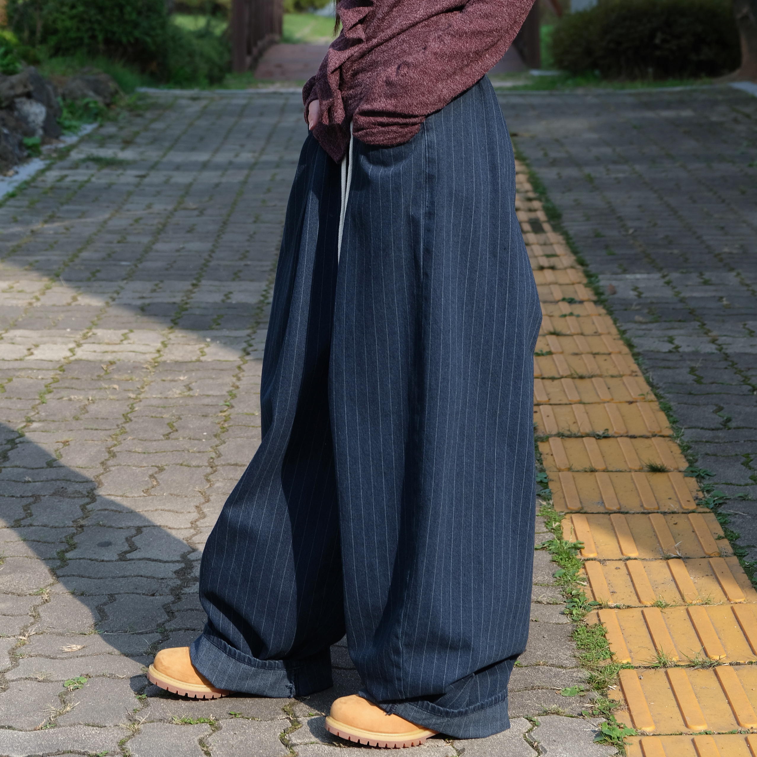 스트라이프 와이드 벌룬 리벳 밴딩 데님