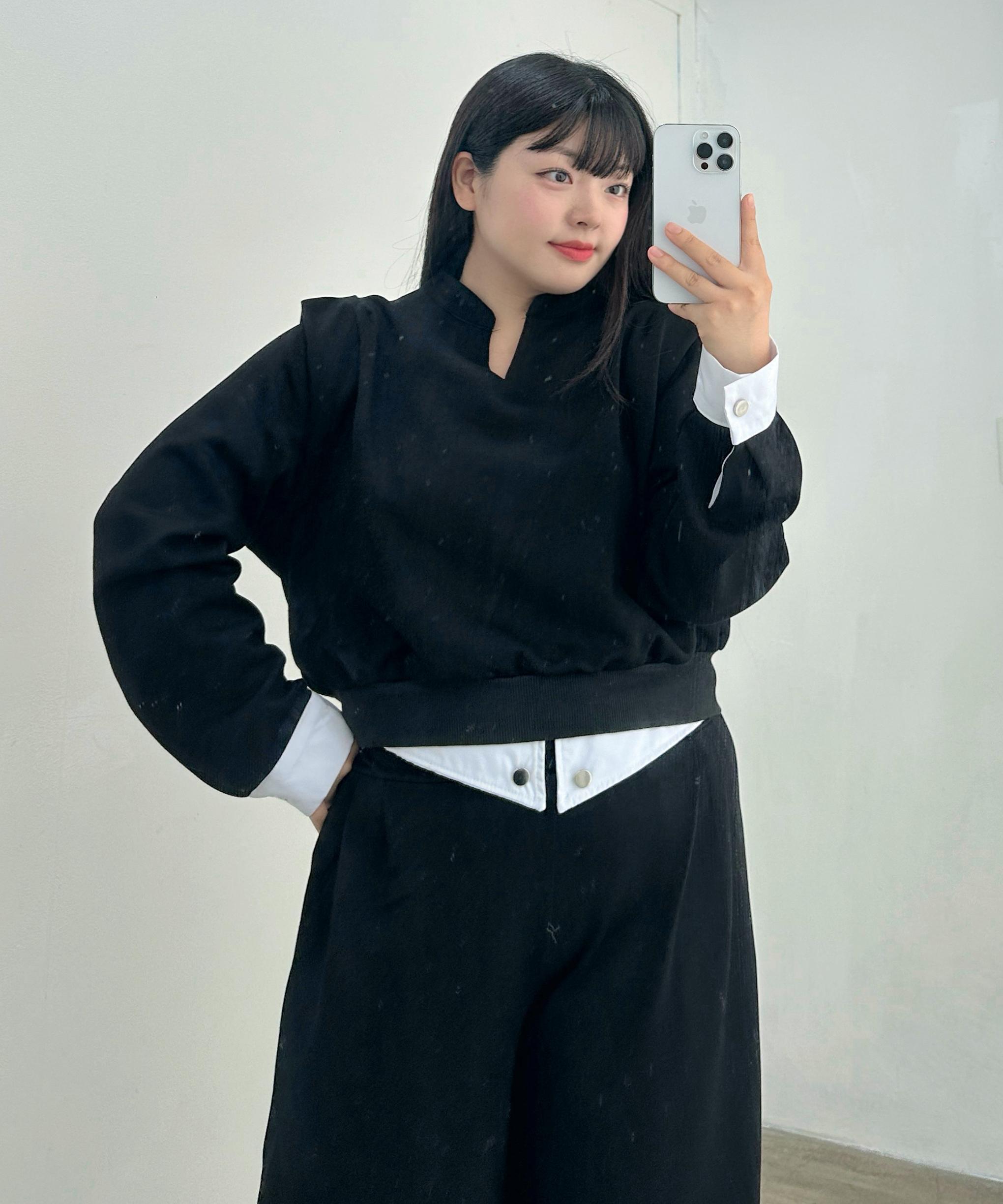 [빅사이즈/체형보정✨] 노아 배색 세미 크롭 맨투맨 하이웨스트 뒷 밴딩 슬랙스 팬츠 맨투맨 트레이닝 투피스세트