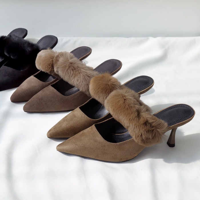 리더프 스웨이드 토끼털 코팅굽 미들힐 뮬 슬리퍼(7cm)