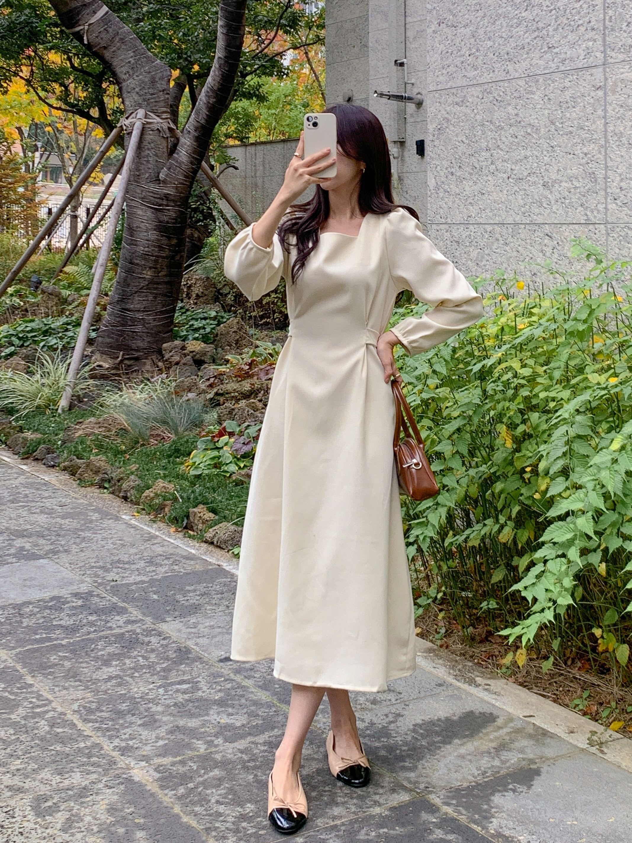 [🚀당일출고] 코듀로이 골덴 긴팔 스퀘어넥 핀턱 롱 원피스 키작녀 봄 가을 회사 오피스 하객룩 결혼식