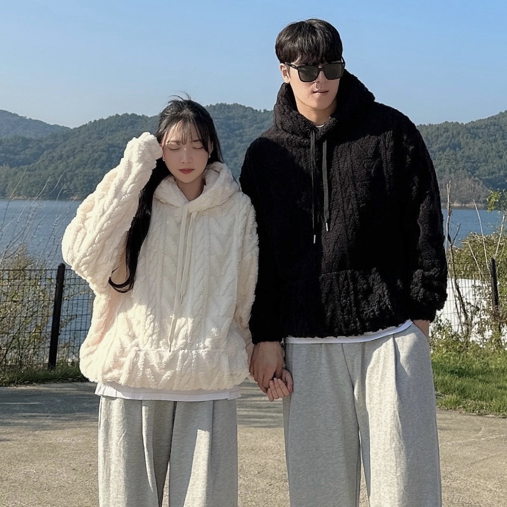 3컬러/ 꽈배기 양털 뽀글이 후드티 남녀공용 오버핏 빅사이즈 아방핏 봄 가을 겨울 커플룩 꾸안꾸 시밀러룩 도톰 후드 맨투맨 남자 겨울옷 케이블 커플티 커플후드