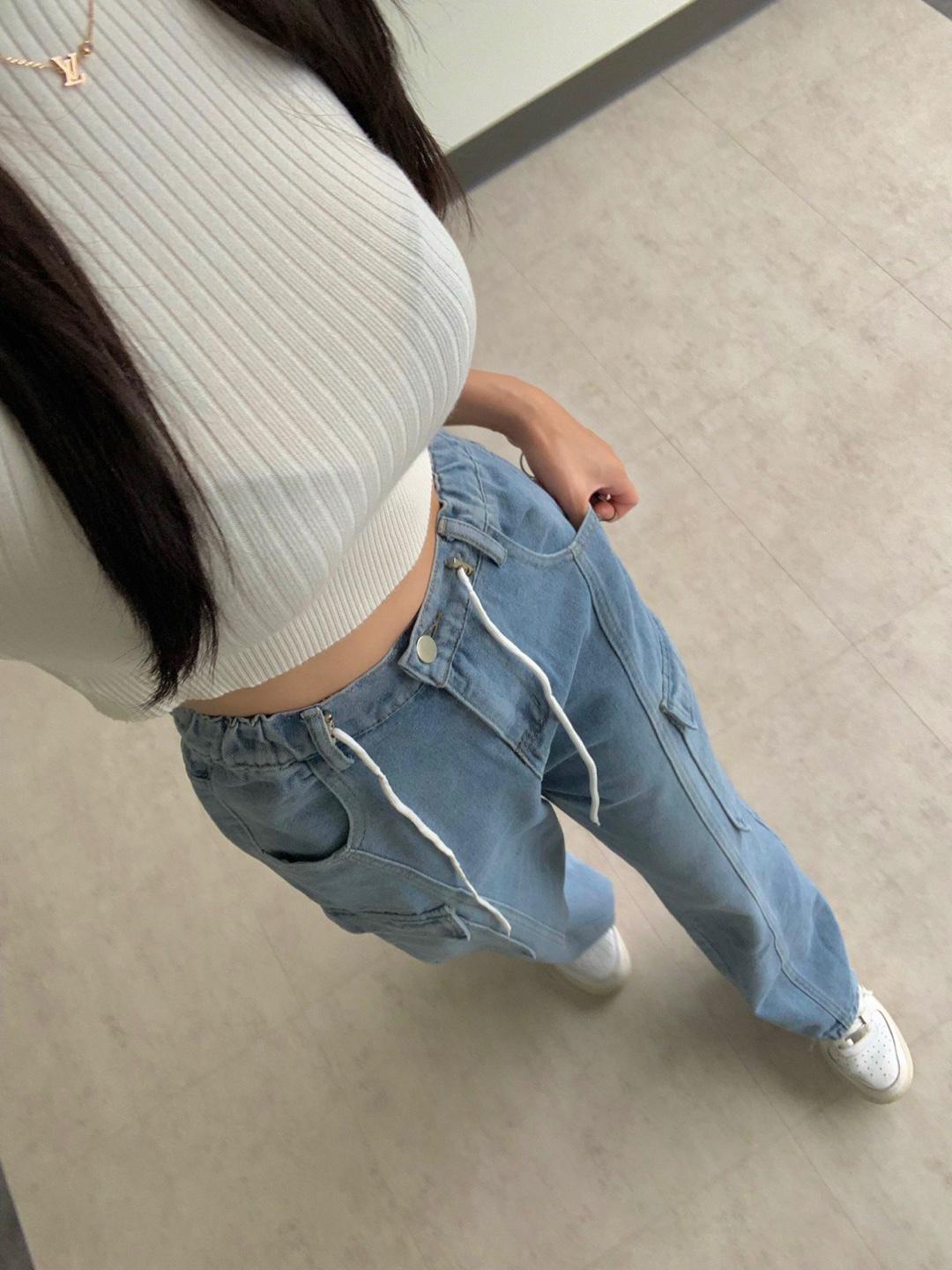 [S-L] 카고 와이드 연청 스트링 허리 밴딩 팬츠