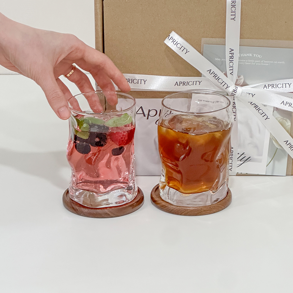 (당일출고🚀) 아이스 큐브 웨이브 medium 유리잔 2인 선물세트 (원목컵받침 포함) 집들이선물 답례품 아이스커피잔 맥주잔 세트