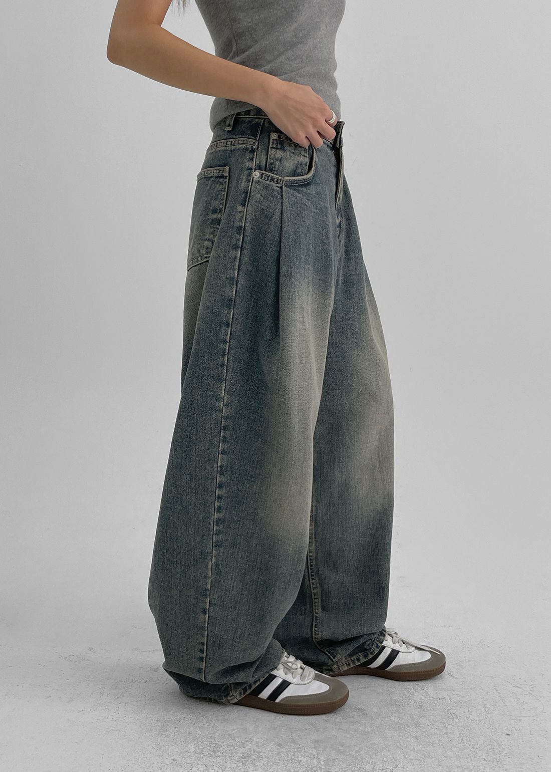 젝틴 핀턱 워싱 와이드 데님팬츠