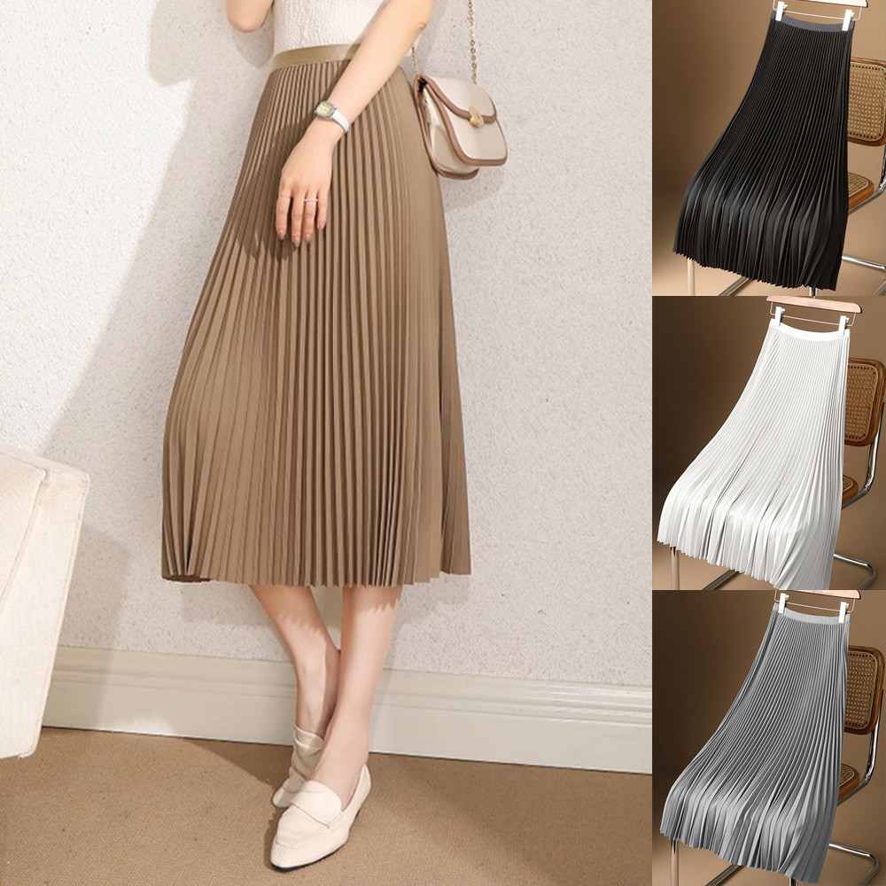 새틴스커트 치마 A라인 미디 핀턱 플리츠 플레어 롱스커트