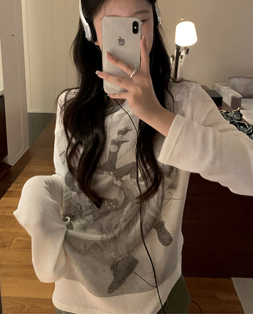리키 세미 루즈핏 프린팅 화이트 긴팔 티셔츠