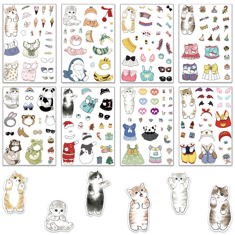 8p 고양이 옷 입히기 씰스티커 키치 감성 빈티지 다꾸 다이어리 꾸미기
