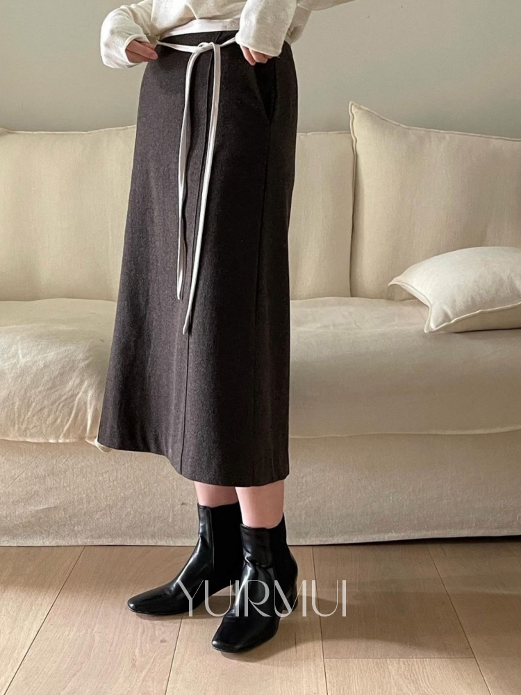 bronze 브론즈 울 배색 스트링 A라인 롱 스커트 2color