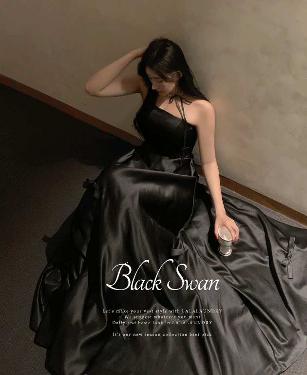 [PREMIUM✨] 블랙스완 리카도 실크 리본 코르셋 플레어 오프숄더 롱 블랙 드레스 원피스