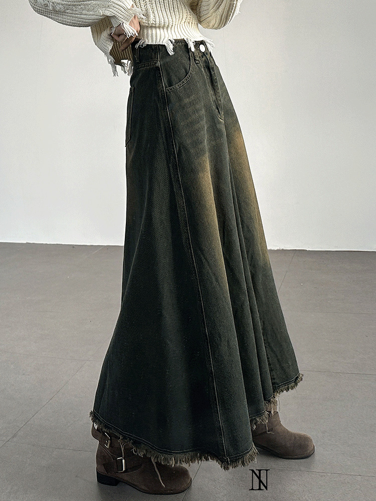 당일출고🚀[가을🍂/vintage🦋] 빈티지 워싱 컷팅 절개라인 A라인 플레어 데님 롱스커트