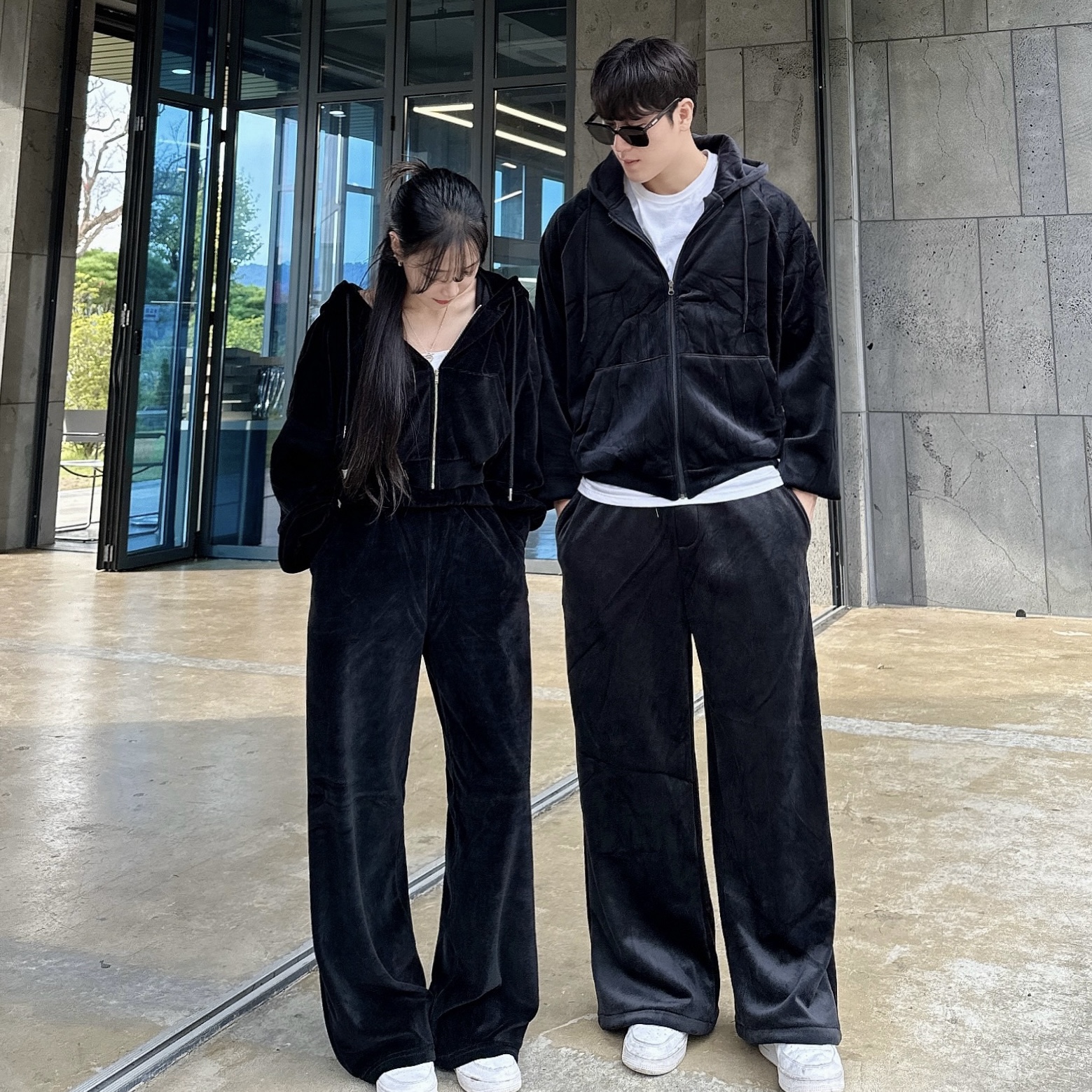 2사이즈/ 벨벳 트레이닝 세트 벨로아 커플 후드 집업 밴딩 와이드 팬츠 봄 가을 겨울 커플룩 크롭 오버핏 시밀러룩 남녀공용 꾸안꾸 코디 세트 투피스 코듀로이 셋업