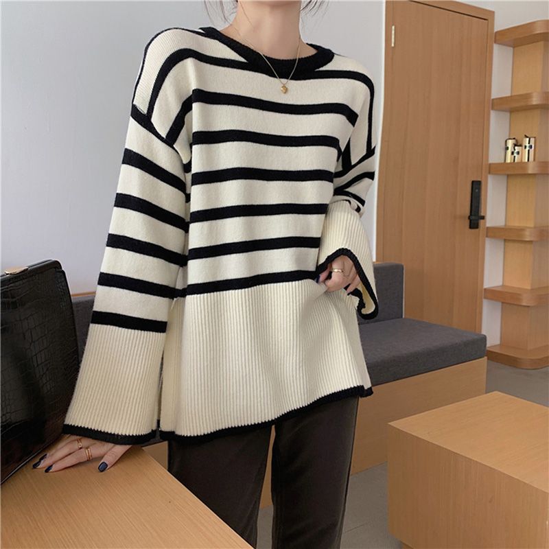 스타일아유 여성용 스트라이프 슬릿 니트 스웨터 감각적인 디테일로 완성된 트렌디 아이템 KN1910