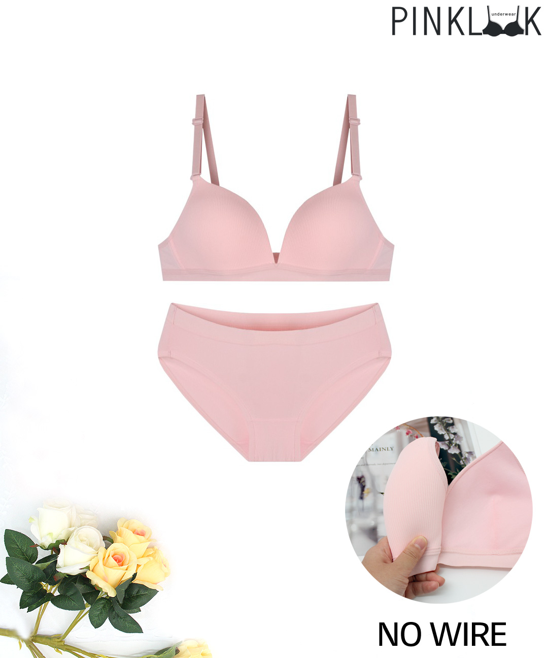 골지 베이지 노와이어 여성속옷 브라팬티 2종세트/핑크