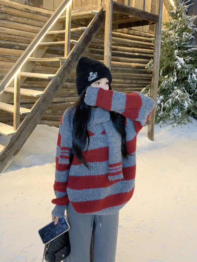 [🧣머플러SET/브이넥니트] 겨울 2color 데일리 도톰 스트라이프 루즈핏 니트 투피스 코쿤