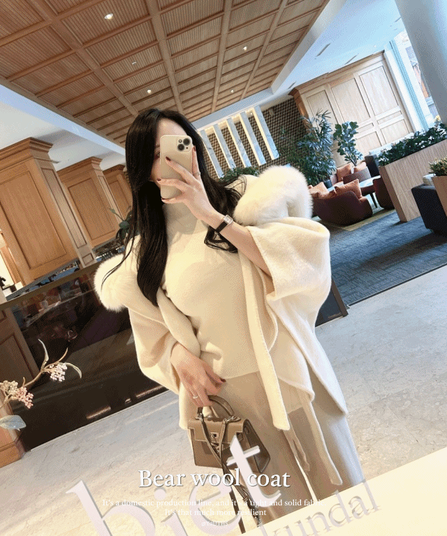 [울100%/꾸안꾸..} 베이 폭스 코트 아이보리 겨울 아우터 겨울 코드 케이프 코트 울 허리끈 폭스 퍼 고급 숏 코트 하프