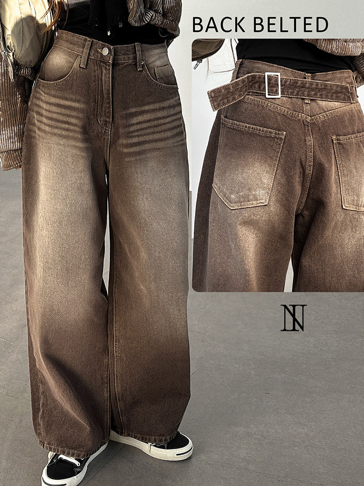 [unique] 백 벨티드 빈티지 워싱 세미 벌룬 와이드 데님팬츠 2color