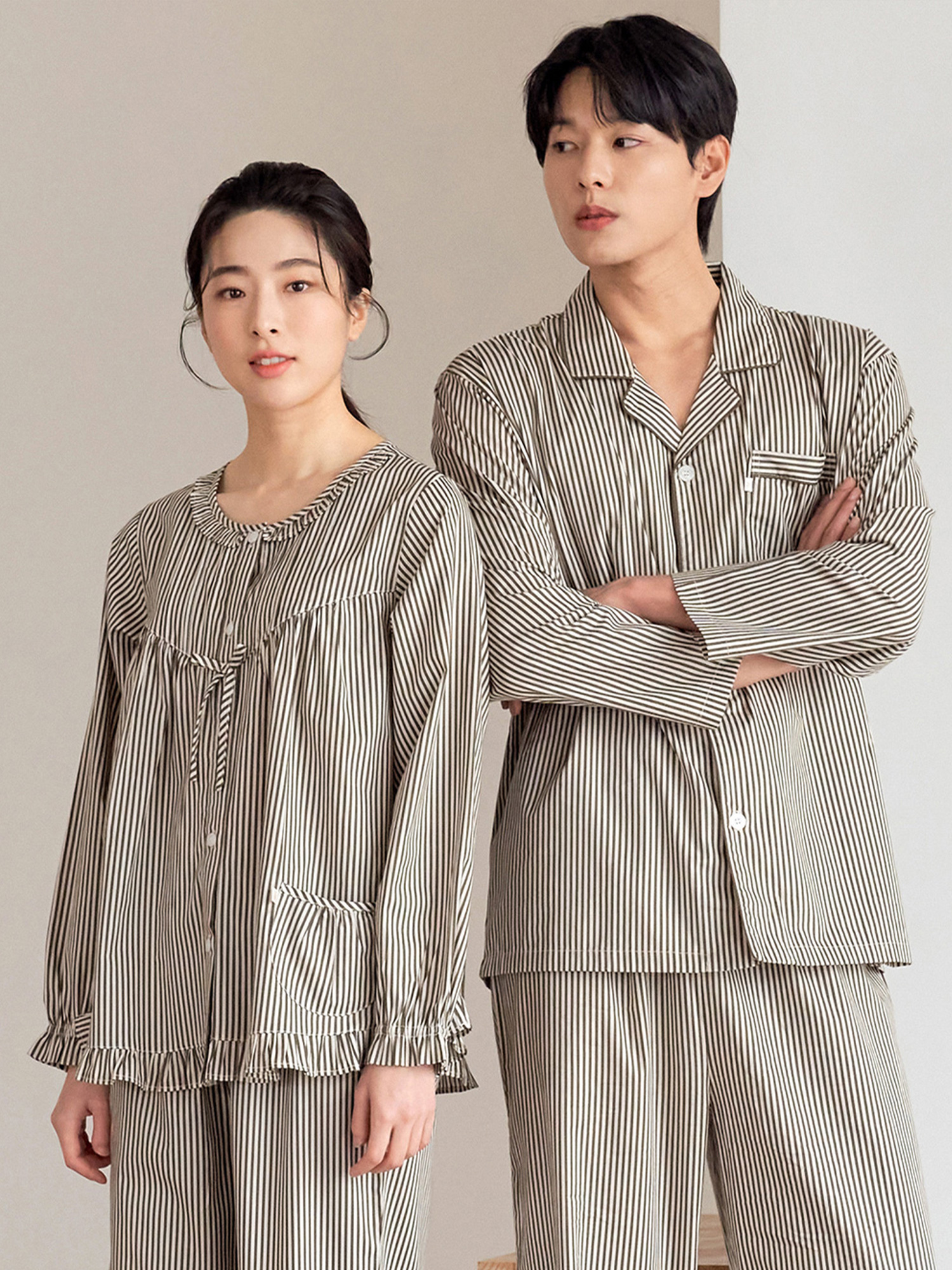 카키ST 긴팔 순면 커플 빅사이즈 잠옷 세트