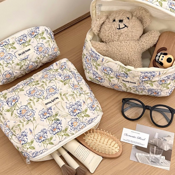 포포로 블루 플라워 대용량 여행용 손잡이 화장품 파우치 펜슬 케이스 가방
