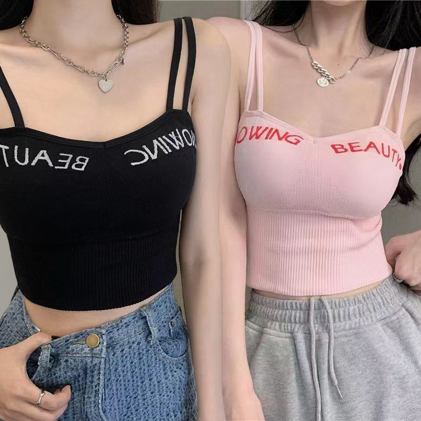 여성 레터링 밴딩 슬림 패드내장 두줄 끈조절 숏 캡나시 브라탑 끈나시 크롭탑 나시탑 레터링슬림패드내장나시