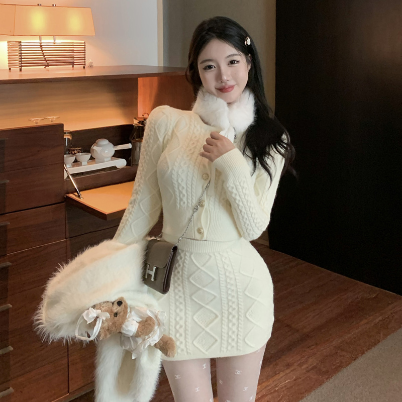 (당일출고/set/연말룩) 탈부착 카라 퍼 리본 꽈베기 꽈배기 골지 크롭 니트 가디건 밴딩 미니 스커트 투피스 세트 파티룩 2color