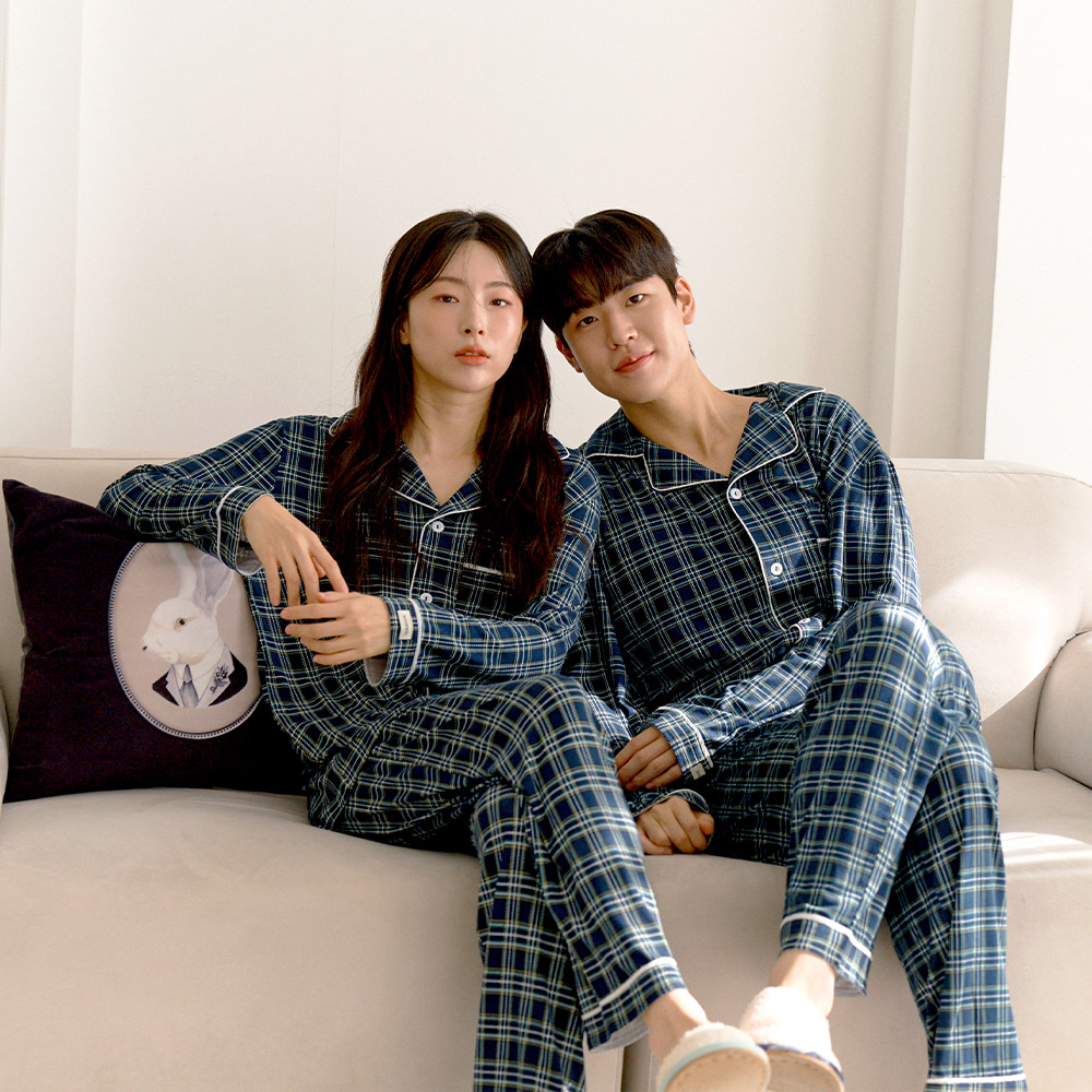 가을 겨울 커플 피치 기모 체크 파자마 잠옷 세트