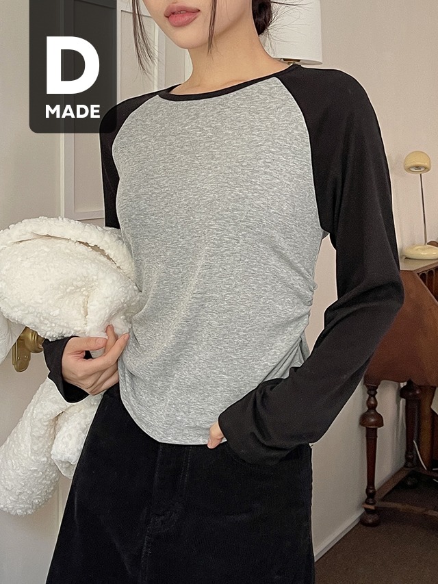[MADE] 빅사이즈 55-99 켄릿 배색 나그랑 래글런 슬림 핏 셔링 세미 크롭 긴팔 티셔츠
