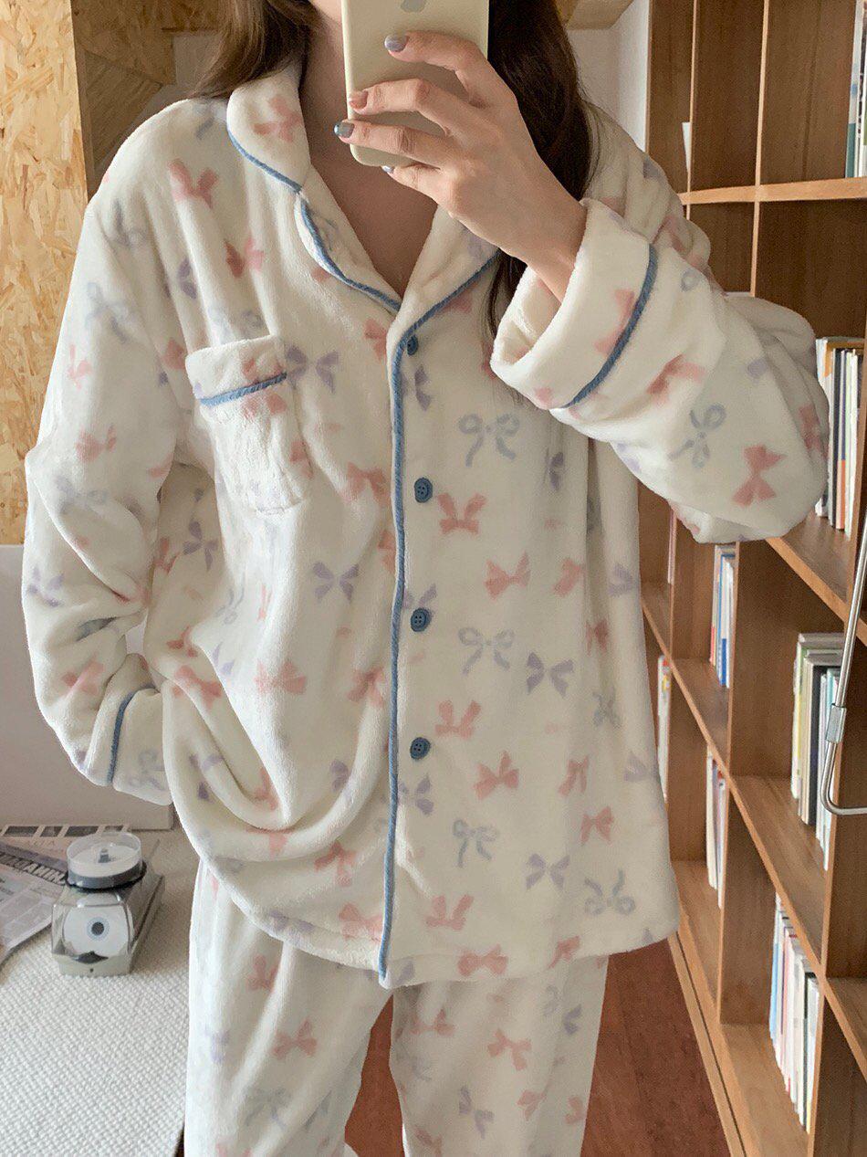 큐티리본 수면잠옷 긴팔 파자마 세트 극세사 후리스 겨울 홈웨어 임산부 파티