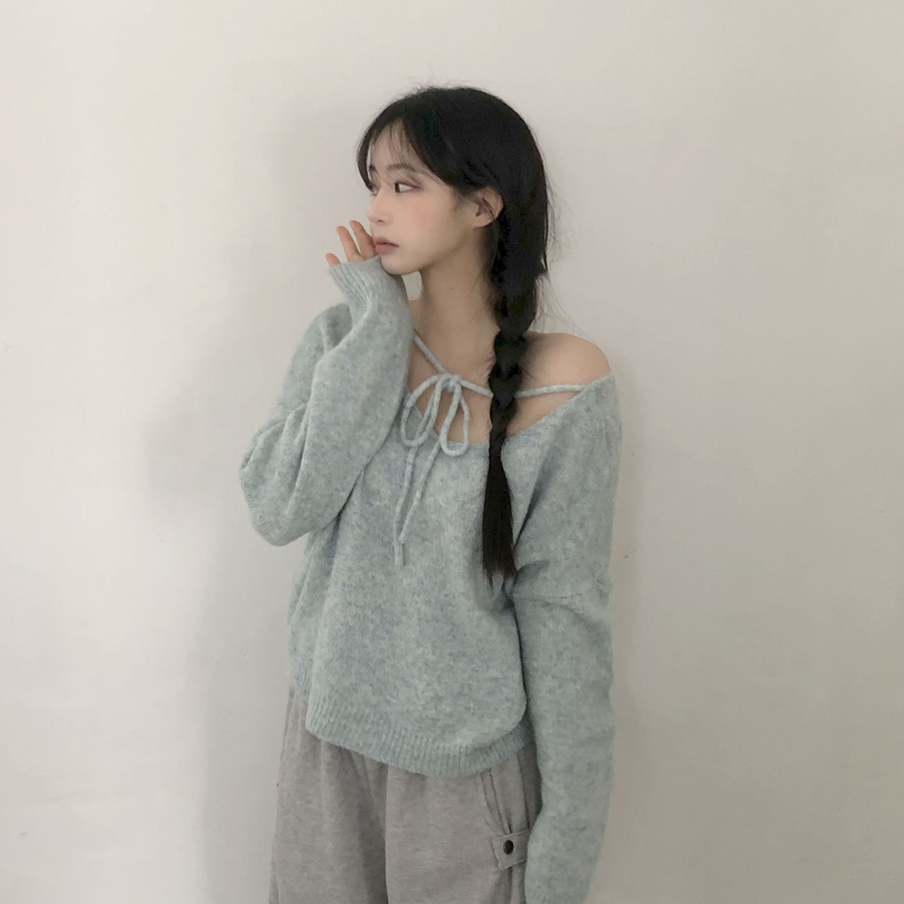 [여리핏보장]알파카 리본 라인 브이넥 긴팔 니트