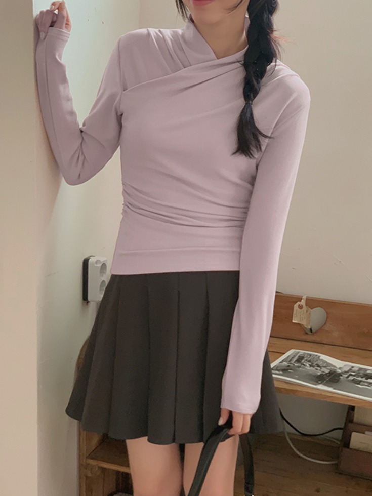 [44-120] 델리틴 스판 랩 핀턱 셔링 긴팔 티셔츠 ( 봄-가을-데일리룩-데이트룩-캐주얼룩-캠퍼스룩-러블리룩-하객룩-격식룩-출근룩-빅사이즈-120사이즈-자체제작-페미닌-신축성-통통녀 )