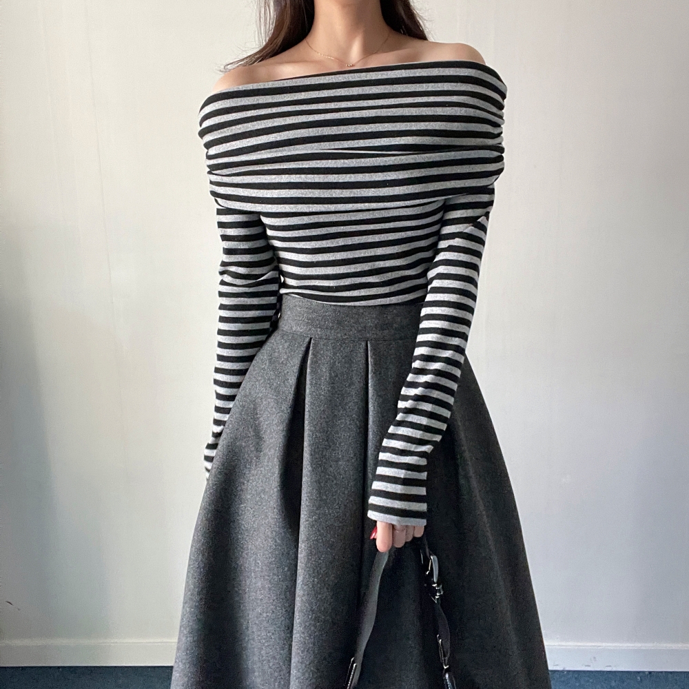 윈터 스트라이프 셔링 숄 긴팔 오프숄더 티셔츠 국내제작 연말 데이트룩