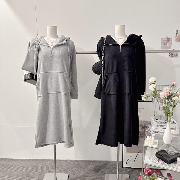 [도톰,폭닥!/꾸안꾸룩!] 봄 이글루 융기모 후리스 플리스 캥거루 포켓 트임 오버핏 슬림핏 벌룬 퍼프 무지 긴팔 후드 집업 롱 원피스 [2color]