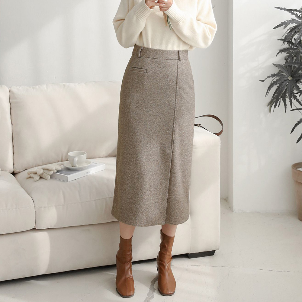 여자 겨울하객룩 헤링본 앞트임 H라인 슬릿 롱스커트