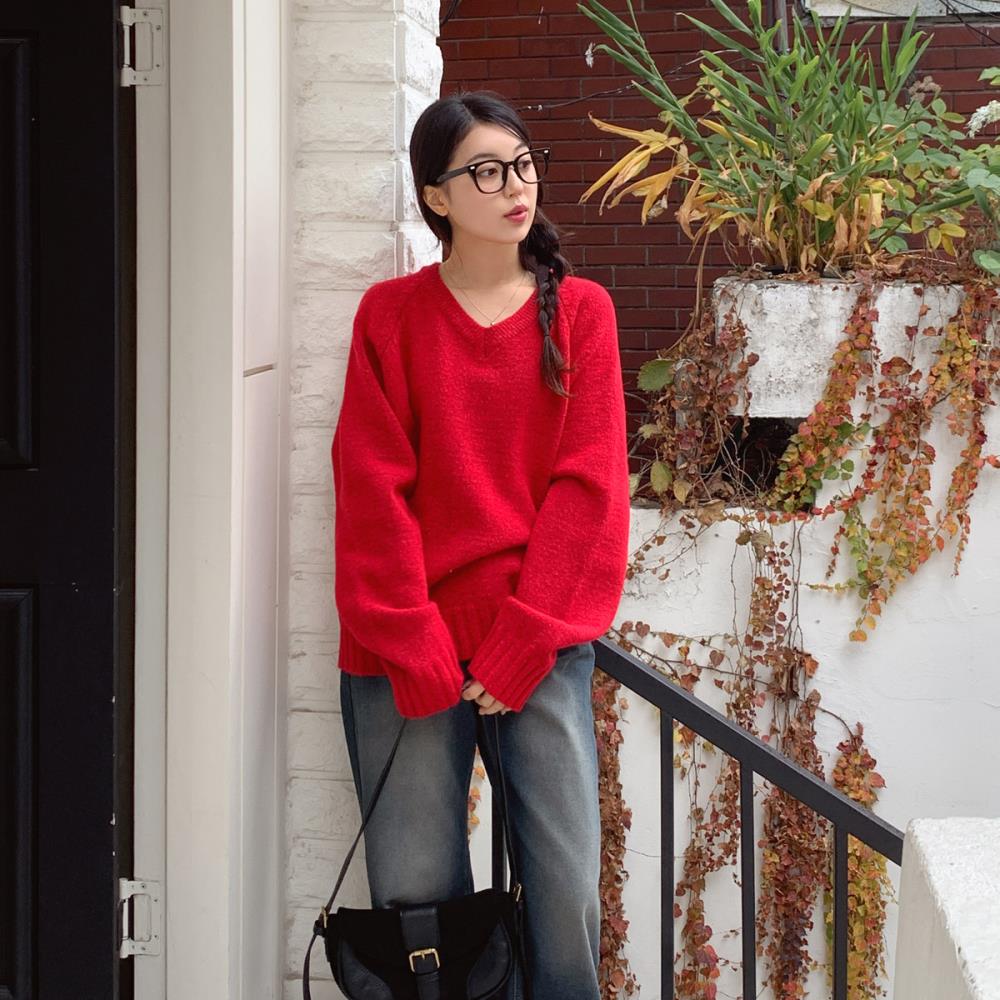 크리스마스 초록 빨간니트 시보리 v넥 무지티셔츠