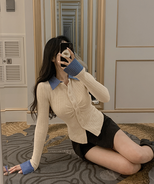 [소라,연그레이-당일발송] 릴트 체크 배색 셔링 cardigan