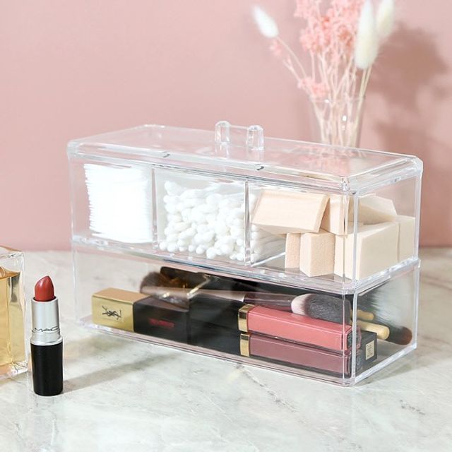 메이크업 정리함 수납 화장솜 먼지차단 아크릴 2단 면봉 오거나이저 보관함 화장품정리 화장품
