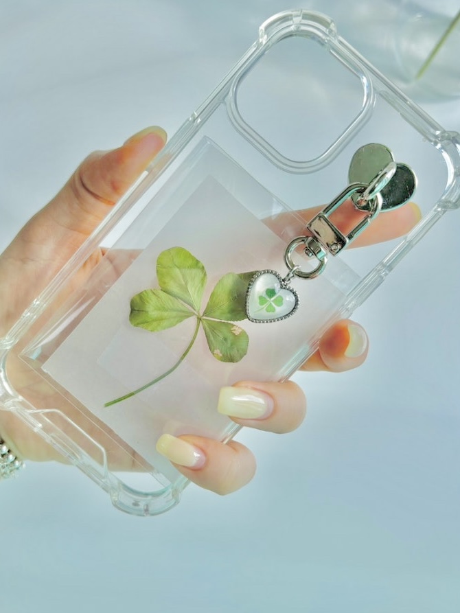 행운의 투명 감성 네잎클로버 키링 (하트 부착 고리 세트) - 아이폰/갤럭시 케이스 액세서리