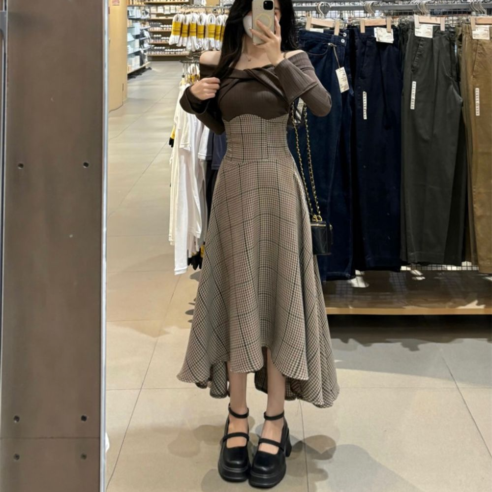 L~4XL연말룩 오프숄더 슬림 브라운톤 페이크 투피스 롱원피스