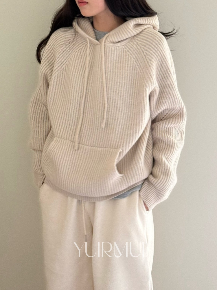 AMYGRACE 에이미그레이스 레터링 울100 골지 포켓 후드 니트 3color