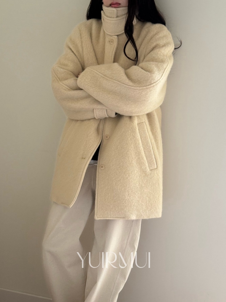 AMYGRACE 에이미그레이스 헤어리 울 알파카 카라 하이넥 하프 코트 2color