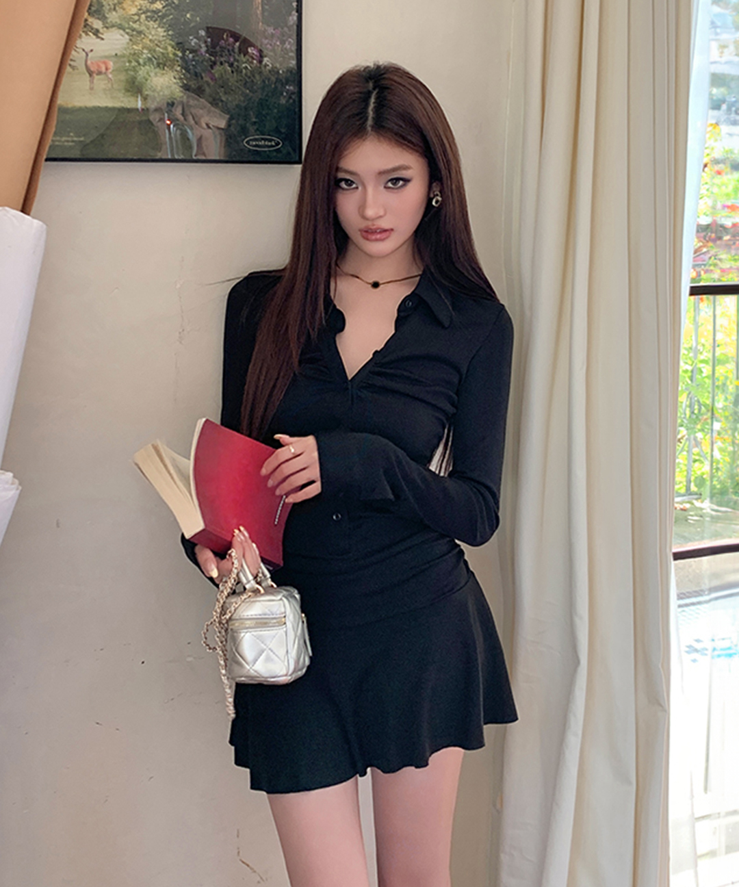 BEST⭐후기극찬 [핏보장][몸매보정🖤/글램핏] 느와 셔링 플레어 블랙 셔츠 미니 원피스