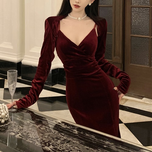 [당일출고] 말끔 겨울 벨벳 롱 원피스 슬림핏 머메이드 드레스 블랙 와인 하객룩 피로연 파티룩 연말룩 브이넥 나시 드레스
