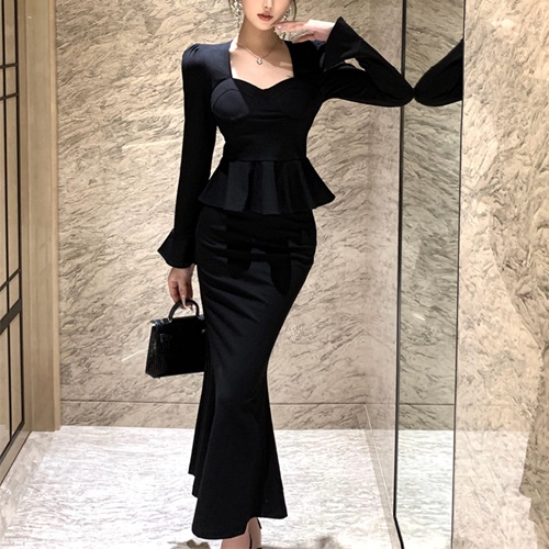 [당일출고] 말랑 블랙 투피스 세트 세미정장 셋업 하객룩 오피스룩 페플럼 블라우스 머메이드 롱 스커트 슬림핏 봄 가을 겨울 피로연 연말 파티룩